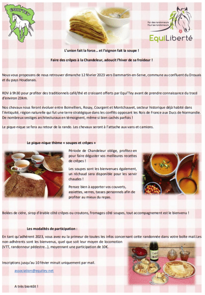 Rando Soupes et Crêpes – 13 février 2023 Rando Soupes et Crêpes – 13 février 2023 17 avril 2023 equitey Commentaires 0 Commentaire [Montrer sous forme de vignettes] Partager : Partager sur X(ouvre dans une nouvelle fenêtre) X Partager sur Facebook(ouvre dans une nouvelle fenêtre) Facebook J’aime ça :J’aime chargement… Articles similaires