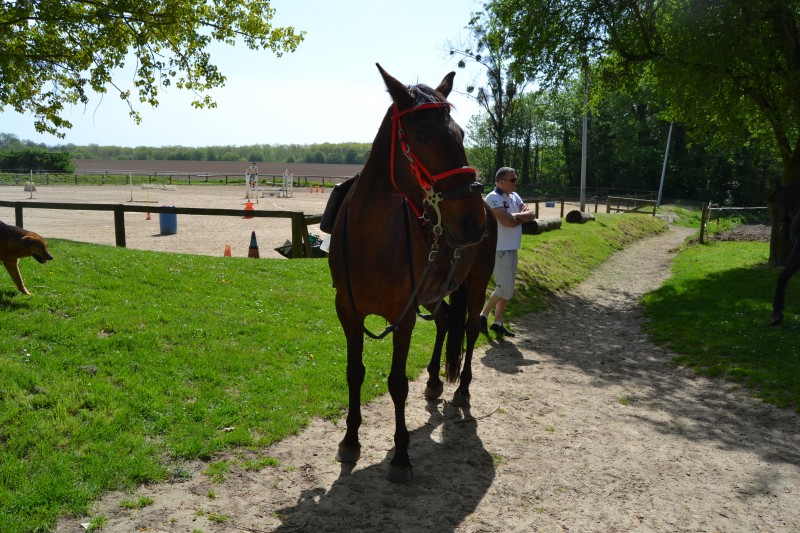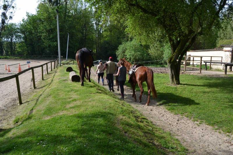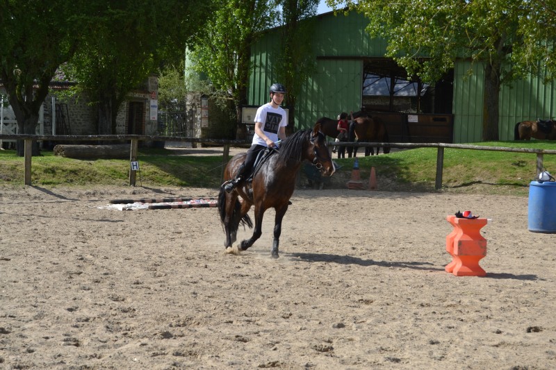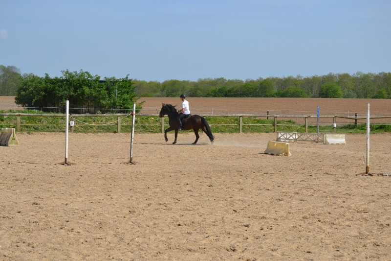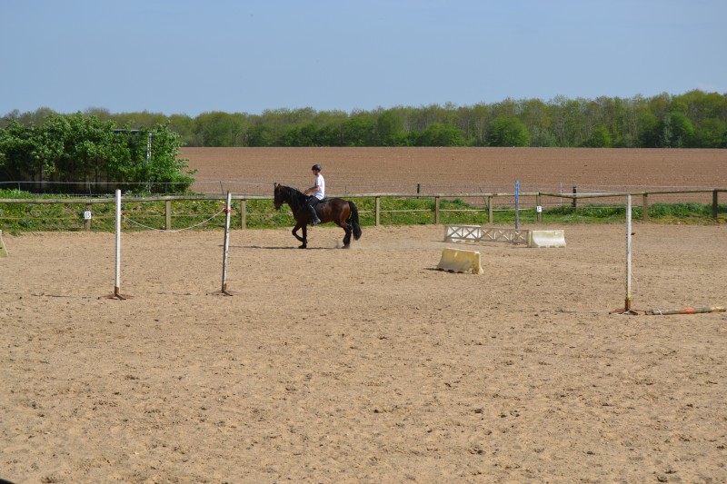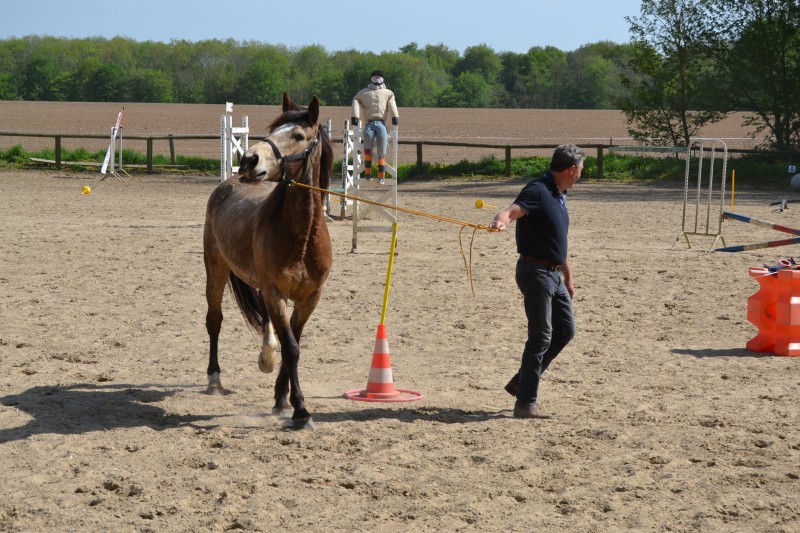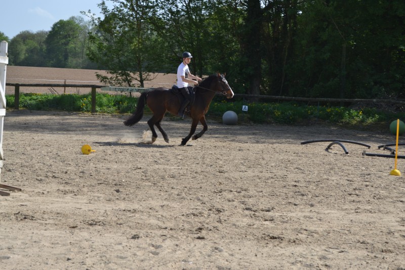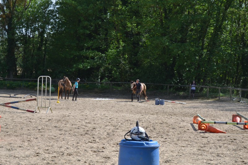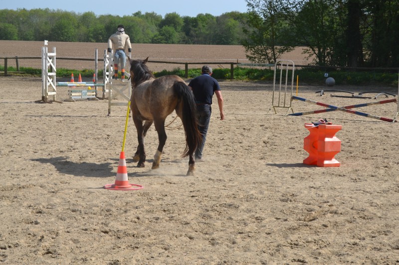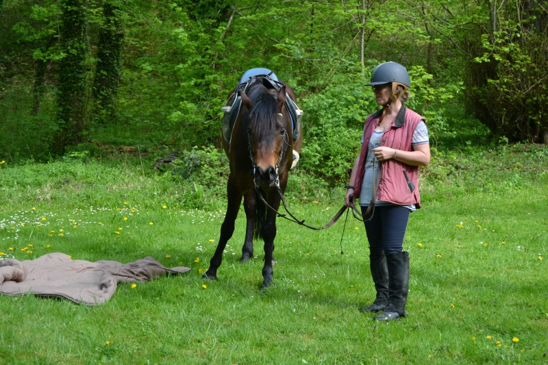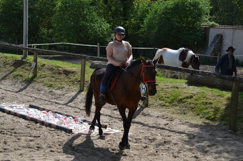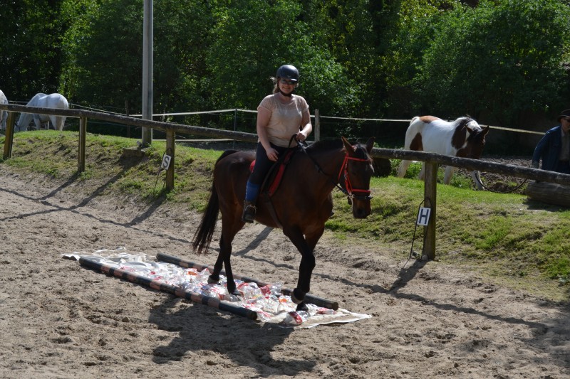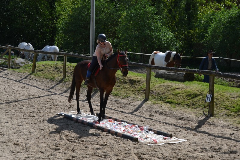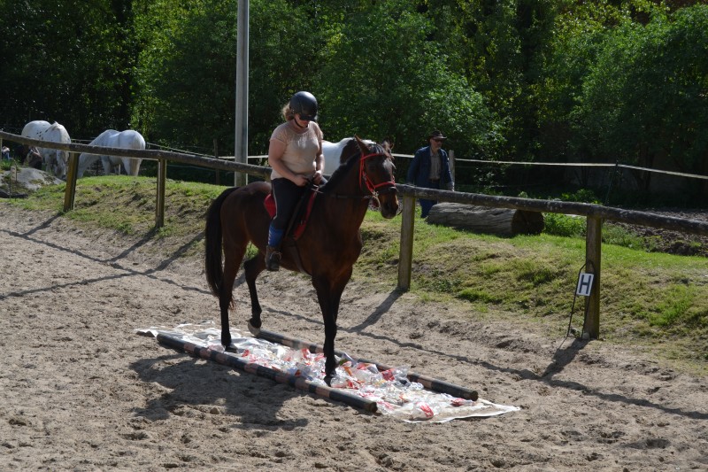 L’après-midi a été consacré à un parcours sur la carrière des écuries, visant à désensibiliser nos chevaux à de nouvelles situations : obstacles divers et variés, bâches (dessus, dessous)